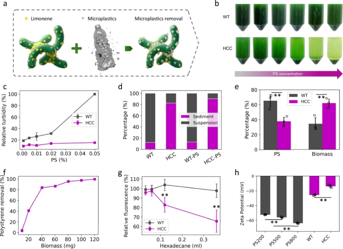 Fig.1|疏水性蓝藻细胞(HCC)对微塑料的去除。a疏水性介导的细胞-柠檬烯-微塑料相互作用的示意图。b将梯度浓度的200 nm聚苯乙烯(PS)微塑料与(野生型)WT和HCC细胞混合(最终浓度从左至右:0%,0.001%,0.005%,0.01%,0.02%,0.05%)。在HCC-PS样品中观察到沉淀,而在WT-PS样品中则无。此外,沉淀随PS浓度增加而增加。c对悬浮液进行低速离心(将微塑料与蓝藻细胞分离)后的进一步分析显示,HCC样品中聚苯丰度显著降低(除0.01%PS浓度下p=0.14外,其余p<0.05)。为便于比较,将含有0.05%PS微塑料的WT样品读数归一化为100%。d发现HCC样品中的沉淀物比例显著高于WT样品(p<0.01)。e与HCCPS悬浮液(37.8%)相比,WTPS悬浮液(65.3%)中的PS比例显著更高(p=0.016)。f实验表明,40 mgHCC足以去除83.7%的5 mgPS微塑料,得出其去除能力约为每克(干重)HCC去除0.1克微塑料。
