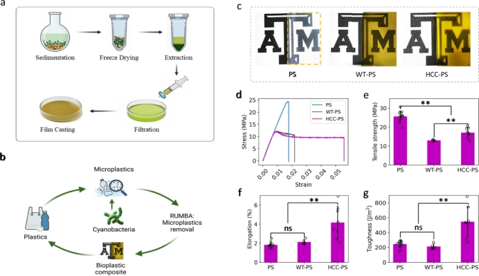 研究提出了创新的下游增值路径。将HCC捕获微塑料后共沉淀产生的混合物(含蓝藻生物质和微塑料),加工制备成新型生物塑料复合材料(图5a)。力学测试显示,与纯PS塑料相比,这种升级循环制成的HCC-PS复合薄膜虽然拉伸强度有所下降,但其伸长率和韧性分别提升了2.3倍和2.2倍(图5d-g),获得了更优的柔韧性和抗冲击性能。这为捕获的微塑料找到了高价值的出路,避免了二次处置难题,真正迈向循环经济(图5b)。