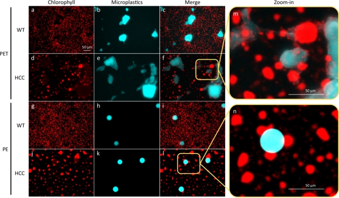 Fig.3|疏水性蓝藻细胞(HCC)捕获聚对苯二甲酸乙二醇酯(PET)和聚乙烯(PE)。使用荧光显微镜评估HCC捕获PET(d-f)和PE(j-l)的能力,并以WT细胞(PET对应a-c,PE对应g-i)作为对照。通过检测叶绿素荧光(激发546/10 nm,发射585/40 nm)观察蓝藻细胞,同时使用DAPI滤光片(激发350/50 nm,发射460/50 nm)观察微塑料的自发荧光。合并图像(PET对应f,PE对应l)和放大图像(m,n)清晰地展示了HCC与微塑料之间的相互作用,而在WT样品(c,i)中未观察到此类相互作用。这些结果支持了HCC捕获微塑料的能力。实验独立重复三次,结果相似。