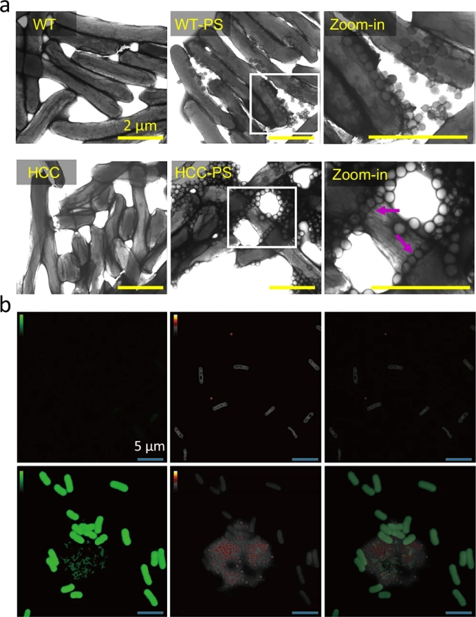 Fig.2|HCC去除微塑料的机理。为验证柠檬烯是HCC捕获微塑料的主要驱动力和介质,我们利用TEM(a)和SRS(b)研究了聚苯乙烯与细胞的相互作用。TEM图像显示,聚苯乙烯(PS)随机附着在WT细胞上,而PS微塑料则富集在HCC细胞的交叉处,该处预计存在柠檬烯以驱动细胞聚集(a)。WT+PS和HCC+PS样品中白色框内的区域被进一步放大显示在第三列,以突出详细的相互作用(放大图)。这些结果有力地支持了HCC主动捕获微塑料的能力。SRS图像(b)证实了HCC-聚苯乙烯样品中存在柠檬烯信号(绿色),以及WT+PS(上行)和HCC+PS(下行)样品中存在聚苯乙烯信号(红色)。合并两个信号表明,HCC与聚苯乙烯之间的相互作用是由柠檬烯与PS微塑料之间的疏水作用驱动的(b中第三列)。实验独立重复三次,结果相似。