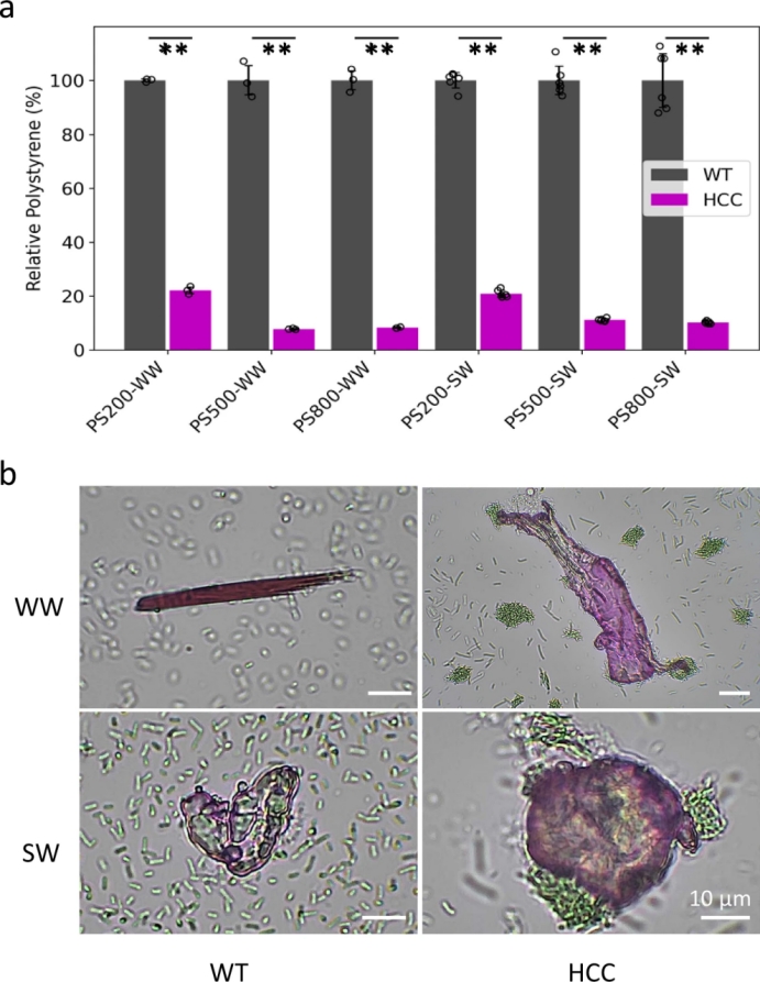 Fig.4|在环境相关条件下评估微塑料去除效果。a将直径为200 nm(PS200)、500 nm(PS500)和800 nm(PS800)的PS微塑料加标到地表水(SW)和废水(WW)样品中。通过测量经低速离心分离后的悬浮液中微塑料的浊度,评估HCC在这些环境中的微塑料去除能力。WT细胞作为基线对照。与WT样品相比,HCC样品悬浮液中的浊度显著降低,表明在此条件下微塑料被有效去除。bHCC与从地表水和废水样品中收集的微塑料相互作用的显微镜观察。在HCC样品中观察到明显的相互作用,而在WT样品中则无,表明HCC具有去除环境中微塑料的能力。数据显示为平均值±标准差(n=3个独立的WW样品和6个独立的SW样品)。